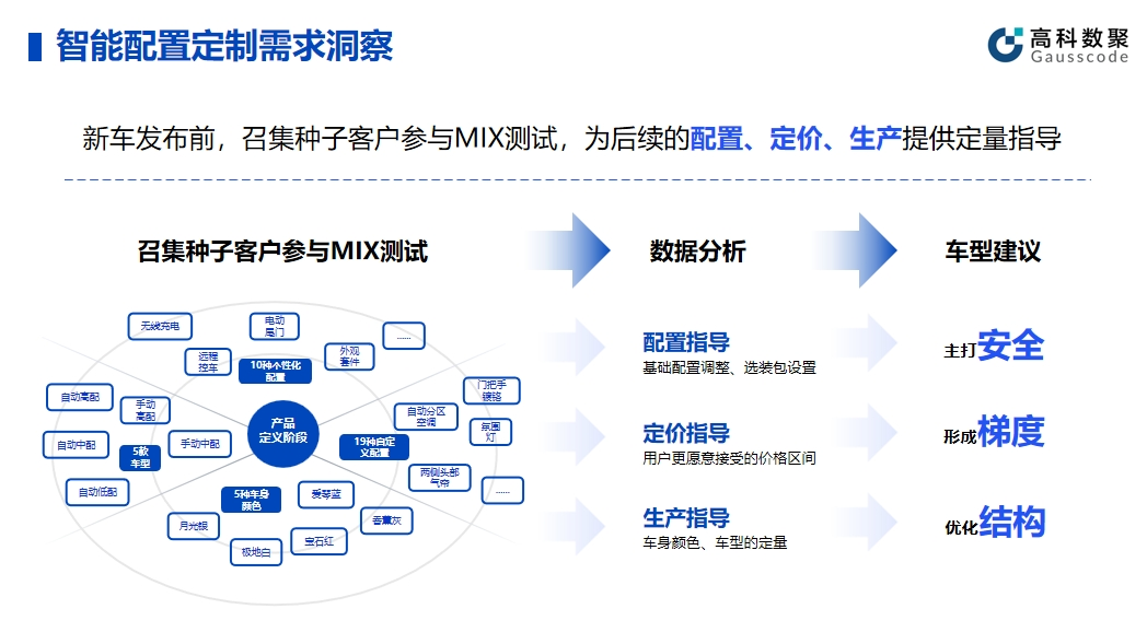 智能配置的有效应用可以帮助企业提升产品和服务的智能化水平。在实际应用中,一竞技官网 一竞技帮助车企在新车发布前召集种子客户参与MIX测试,顺利获得收集种子客户的反馈和数据,车企能够精细调整产品配置,为后续的配置、定价、生产给予定量指导。同时,这种方法不仅有助于提高产品质量,还能提前发现潜在问题并及时解决。